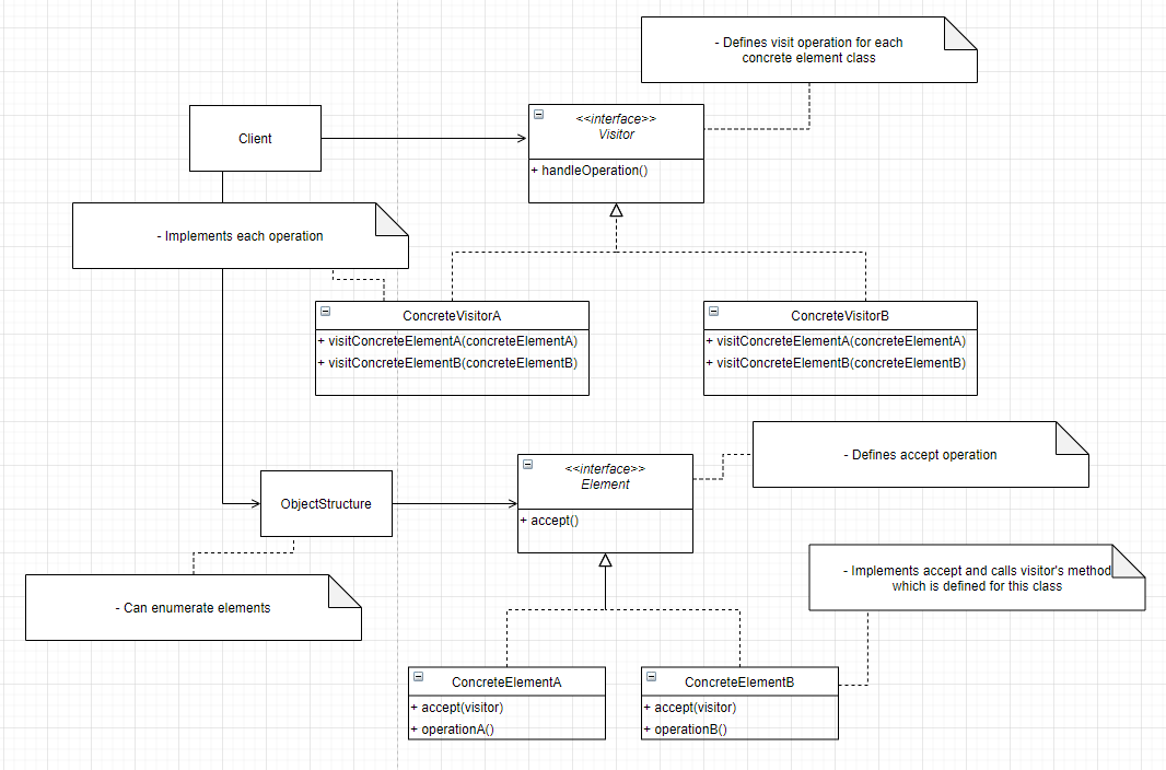 - Think of this pattern as an object visitor that visits all nodes in an object structure. Each time our visitor visits a particular object from the object structure, that object calls a specific method on a visitor, passing itself as an argument.