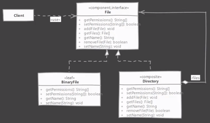 //The component base class for composite pattern //defines operations applicable both leaf & composite abstract class File { private String name; public File(String name) { this.name = name; } public String getName() { return name; } public void setName(String name) { this.name = name; } public abstract void ls(); // Child management operations public abstract void addFile(File file); public abstract File[] getFiles(); public abstract boolean removeFile(File file); } //Composite in the composite pattern class Directory extends File{ private List<File> children = new ArrayList<>(); public Directory(String name) { super(name); } @Override public void ls() { System.out.println(getName()); children.forEach(File::ls); } @Override public void addFile(File file) { children.add(file); } @Override public File[] getFiles() { return children.toArray(new File[children.size()]); } @Override public boolean removeFile(File file) { return children.remove(file); } } //Leaf node in composite pattern class BinaryFile extends File { private long size; public BinaryFile(String name, long size) { super(name); this.size = size; } @Override public void ls() { System.out.println(getName() + "\t" + size); } @Override public void addFile(File file) { throw new UnsupportedOperationException("Leaf node doesn't support add operation"); } @Override public File[] getFiles() { throw new UnsupportedOperationException("Leaf node doesn't support add operation"); } @Override public boolean removeFile(File file) { throw new UnsupportedOperationException("Leaf node doesn't support add operation"); } } public class Client { public static void main(String[] args) { File root1 = createTreeOne(); root1.ls(); System.out.println("**************"); File root2 = createTreeTwo(); root2.ls(); } // Client builds tree using leaf and composites private static File createTreeOne() { File file1 = new BinaryFile("File1", 1000); Directory dir1 = new Directory("dir1"); dir1.addFile(file1); File file2 = new BinaryFile("file2", 2000); File file3 = new BinaryFile("file3", 150); Directory dir2 = new Directory("dir2"); dir2.addFile(file2); dir2.addFile(file3); dir2.addFile(dir1); return dir2; } private static File createTreeTwo() { return new BinaryFile("Another file", 200); } }6. Reference