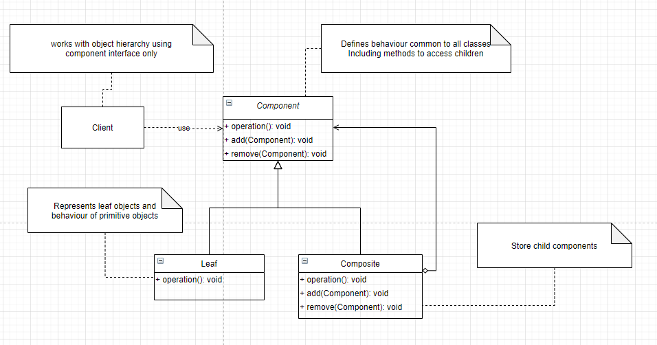 - The overall goal of design should be to make the client code easier to implement when using composite. This is possible if the client code can work with a component interface only and doesn't need to worry about the leaf-composite distinction.