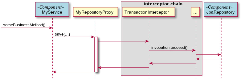 class TransactionInterceptor implements MethodInterceptor { @Override public Object invoke(MethodInvocation invocation) throws Throwable { // Start transaction Transaction transaction = … try { Object result = invocation.proceed(); // 1 transaction.commit() return result; } catch (RuntimeException e) { transaction.rollback() throw e; } } } // Wrapping the application component into a transactional proxy JpaRepository repository = new JpaRepository(); ProxyFactory factory = new ProxyFactory(repository); factory.addAdvice(new TransactionInterceptor()); MyRepository proxy = factory.getProxy();invocation.proceed() triggers all other interceptors in the chain and the invocation of the method on the final target instance eventually.