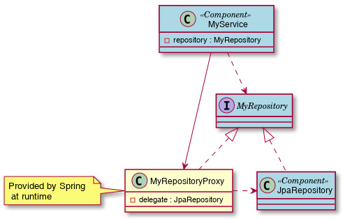 Note, how MyRepositoryProxy implements MyRepository so that it can act as a replacement for the user provided JpaRepository within MyService.