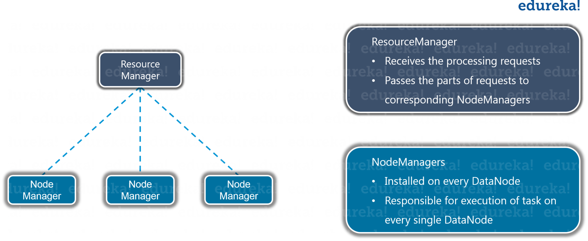 ResourceManager is again a master node. It receives the processing requests and then passes the parts of requests to corresponding NodeManagers accordingly, where the actual processing takes place. NodeManagers are installed on every DataNode. It is responsible for the execution of the task on every single DataNode.