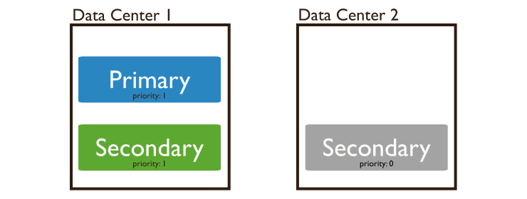 For example, in the following diagram, one data center hosts the primary and a secondary. A second data center hosts a secondary with priority 0. Only the members in data center 1 can become primary.