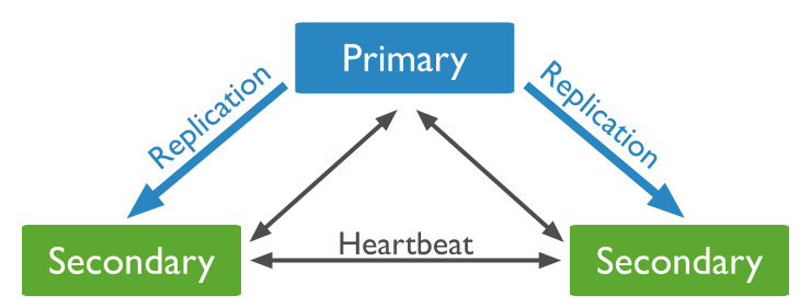 These deployments provide two complete copies of the data set at all times in addition to the primary. These replica sets provide additional fault tolerance and high availability. If the primary is unavailable, the replica set elects a secondary to be primary and continues normal operation. The old primary rejoins the set when available.