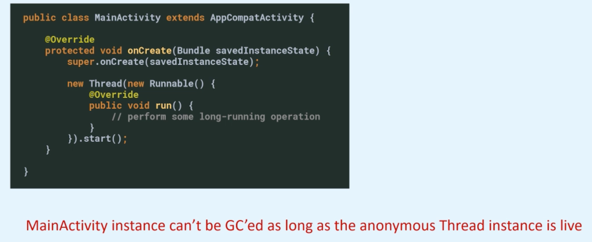 MainActivity instance can be garbage collected as long as the anonymous Thread instance is live. So for as long as this Thread takes to execute, garbage collector won't be able to basically claim the memory associated with MainActivity. And if this Thread runs forever, well, then MainActivity will be leaked forever.