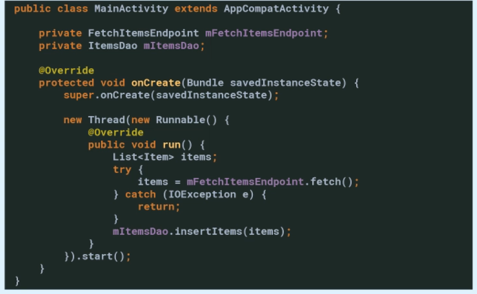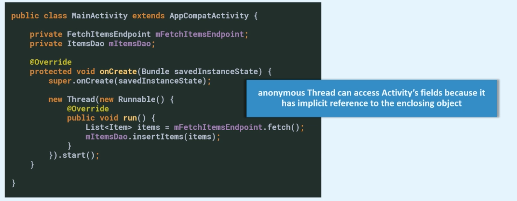 Let's say we've got this main activity that instantiates a new anonymous thread, and inside this thread, we basically do two things. One, fetch some items from the endpoint. And then, after we get these items, we want to insert them into our local database. So, two actions and the reason why we want to do that on a stand-alone thread is that both of these actions can take a considerable amount of time. And we wouldn't like to let these actions interfere with other processing in our application, so we start a new thread. However long these two actions will take, after both of them complete, the run method will return naturally and this anonymous thread will be dead afterward. One interesting thing to note here is that inside this anonymous thread, I'm using fields of the enclosing main activity. And that's only possible because this anonymous thread has an implicit reference to the enclosing object. In this case, that might not be a problem because these actions will take five, 10 seconds, 15 seconds, and then this thread will be dead and the activity will become eligible for garbage collection. But that's not always the case. Sometimes you might have some process inside your thread that can actually take a lot of time or maybe it will never complete. In these cases, the thread will basically hold on to this activity indefinitely and it might cause a memory leak.