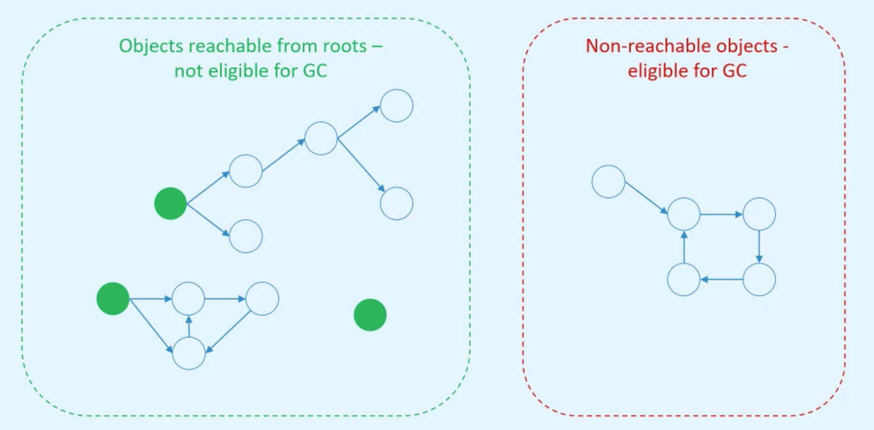 Roots are the objects that basically hold other objects in memory. Roots are not reachable for garbage collection because roots aren't eligible for garbage collection. All other groups of objects which don't have any kind of references from roots, even if they have circle references inside the groups themselves, so these objects that aren't referenced from roots, there are non-reachable and therefore garbage collector will clean them.