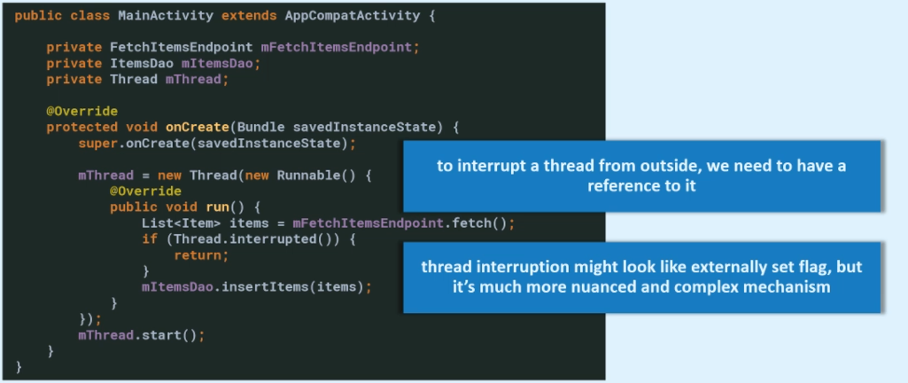 Inside the run method, after the fetch is completed, we'll check the value of this flag and if this flag is true, again, short-circuit and return from run method without inserting items into the database. In other words, if any entity in our application will change the value of this flag to true, then this thread will short-circuit and return from its run method without executing all the code. One very interesting and tricky thing to note here is that if this flag is changed after the thread passes this if check, then this will have no effect whatsoever. So, you need to keep in mind that changing the value of this flag doesn't necessarily mean that the operation will be aborted. It might be the case that you change the value of this flag and the operation still succeeds.