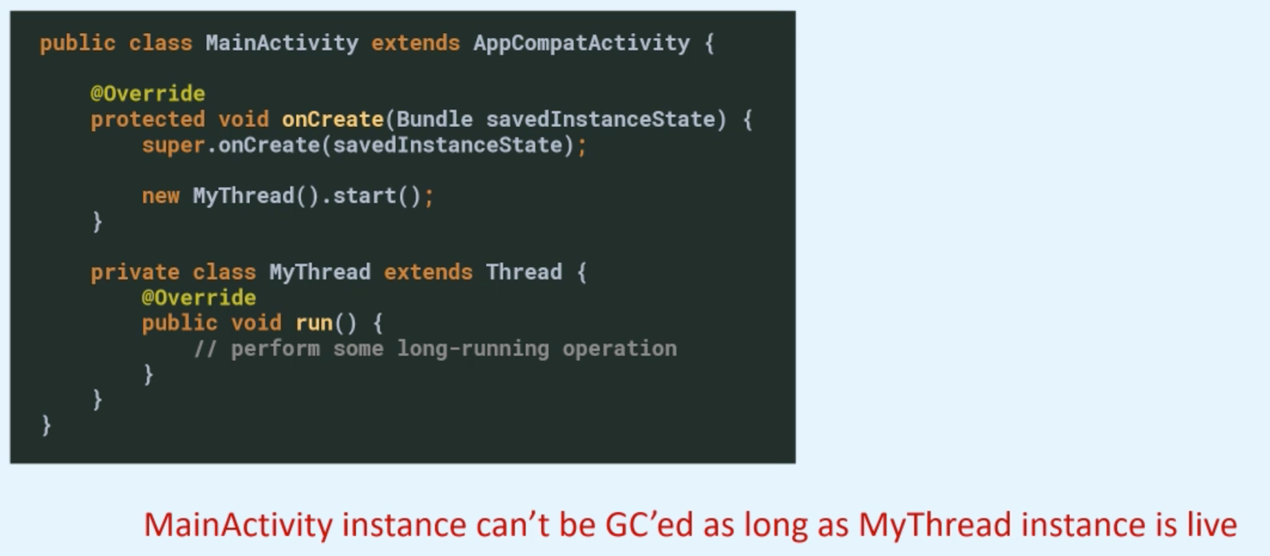 if you have like inner thread and we instantiate and start it, this Thread will, again, have an implicit reference to the enclosing instance of MainActivity. And as long as this thread is alive, garbage collector won't be able to clean the memory associated with the enclosing MainActivity even if that activity is not in use anymore. For instance, its own destroy method has already been called by the system and another activity is being recreated instead of, for example, if you rotate your phone, as long as this thread is alive, then all instance of MainActivity will hang around, and if the run method of this Thread never returns, then basically I would just leak my MainActivity forever.
