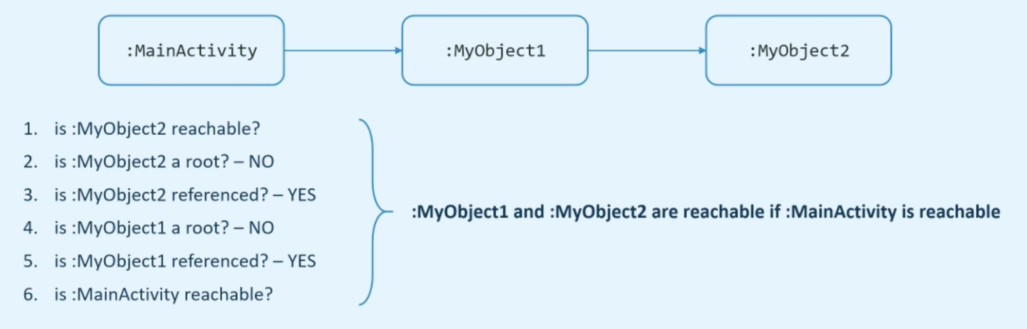 Basically your custom subclass of the application class. And the rigorously speaking application subclasses are in proper Java roots. However, for all practical purposes, these objects behave like roots in the context of one single Android application. Therefore, the exact distinction between them and real roots isn't that important. So you just need to remember that if you reference something from the application class, then that object will be held in memory basically as long as you hold a reference to it in application class.