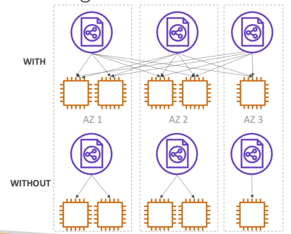 - With Cross Zone Load Balancing: each load balancer instance distributes evenly across all registered instances in all AZ