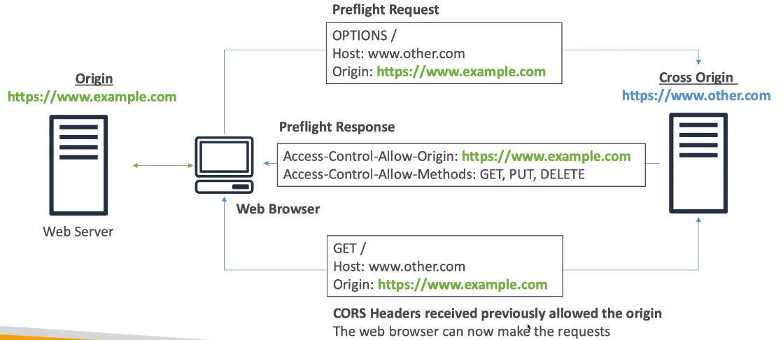 - The requests won't be fulfilled unless the other origin allows for the requests, using CORS Headers (ex: Access-Control-Allow-Origin)