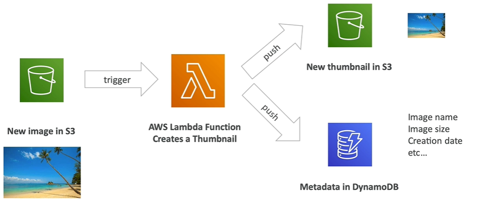 So let's say we have an S3 bucket, and we want to create thumbnails on the fly, so there will be an event, which is, that the new image will be uploaded in Amazon S3. This will trigger through an S3 event notification, a Lambda function. And that lambda function will have code to generate a thumbnail.