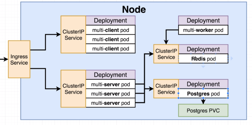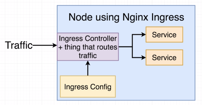 Exposes a set of services to the outside world. Traffic is going to come into this ingress and then once traffic has come in it is then effectively inside of our cluster. And so from that point on our cluster IPs will be accessible only through the ingress service.