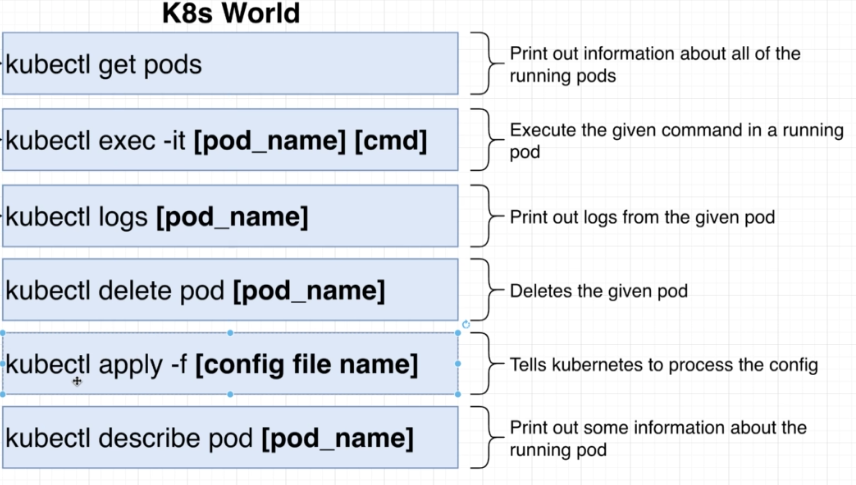 # K8s is extensible. we can add in our own custom objects. # This specifies the set of objects we want K8s to look at apiVersion: v1 # The type of object we want to create kind: Pod # Config options for the object we are about to create metadata: # When the pod is created, give it a name of 'posts' name: posts # The exact attributes we want to apply to the object we are about to create spec: # We can create many containers in a single pod containers: # Make a container with a name of 'posts' - name: posts # The exact image we want to use image: demyank88/posts:0.0.115. Common Kubectl Commands
