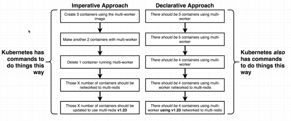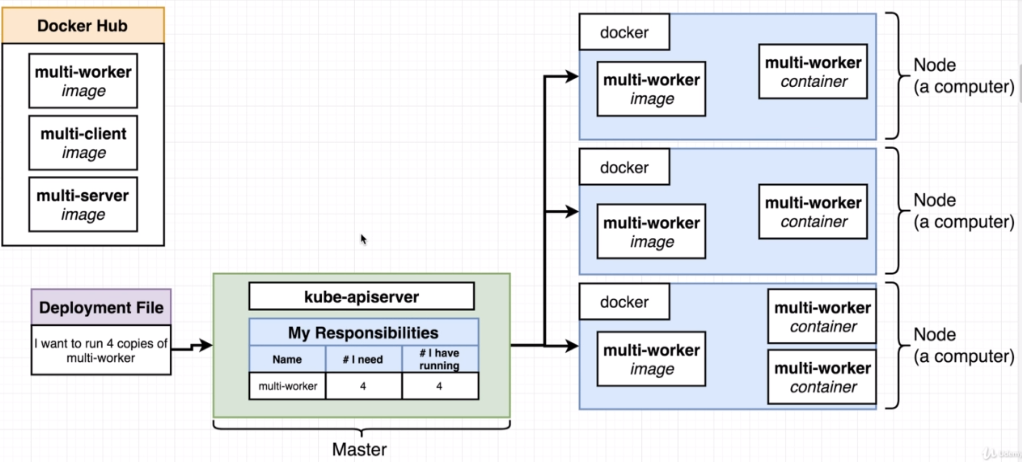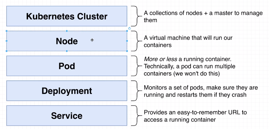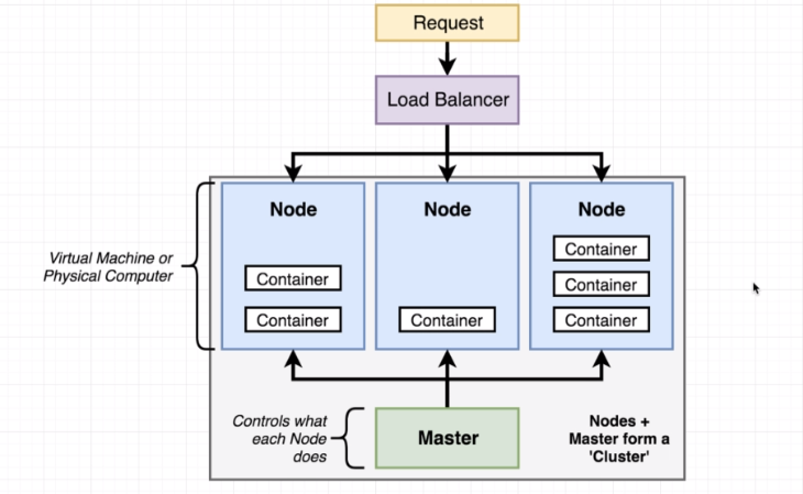 Kubernetes is a system to deploy containerized apps. Nodes in Kubernetes are individual machines (or VM's) that run containers. Masters are machines (or VM's) with a set of programs to manage nodes. Kubernetes didn't build our images. It got them from somewhere else such as the docker hub. Kubernetes (the master) decided where to run each container. Each node can run a dissimilar set of containers. To deploy something, we update the desired state of the master with a config file. The master works constantly to meet your desired state.