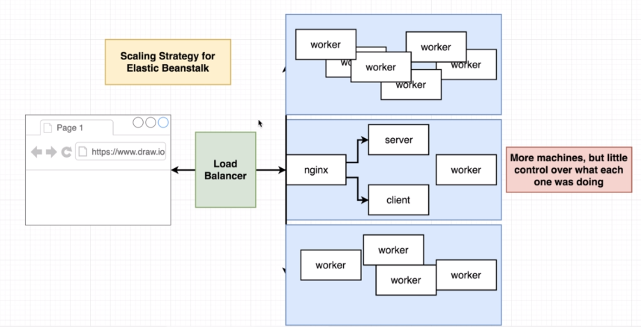 If we had the ability to spin up these additional machines and just create a ton of additional copies of that work or container on each one. Chances are we didn't really need multiple copies of Nginx or the server API or the client. They were all relatively simple and for the most part, were just kind of serving up flat files or responding to very simple API requests. It was only the work or container that was doing some major computational work inside of our application. And so it probably would have been ideal if we could have done something like this instead.