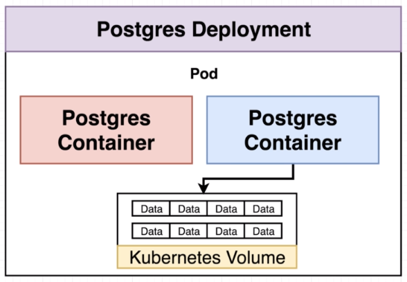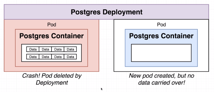 The volume is tied to the pod and so is the pod itself ever dies the volume dies and goes away as well. So a volume and Kubernetes will survive container restarts inside of a pod. But if the pod itself for whatever reason ever gets recreated or terminated deleted whatever happens then the pod and the volume inside of it totally gone. A volume is really not appropriate for storing data such as the database.