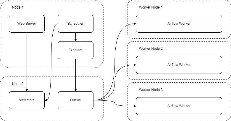 - You have multiple nodes, multiple machines where on each machine you will have airflow worker running