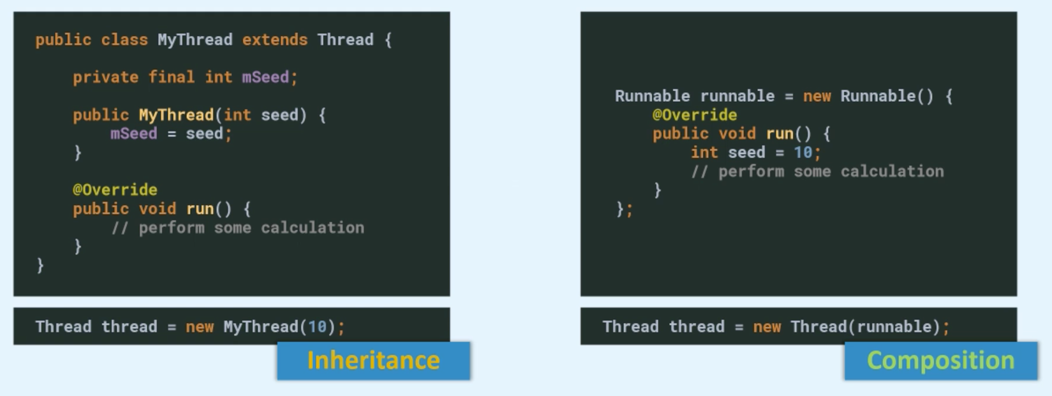 public class demo { public static void main(String[] args) { // inline anonymous implementation of Runnable inheritance Thread t1 = new Thread(new Runnable() { @Override public void run() { System.out.println("Hello from " + Thread.currentThread().getName()); } }); // Create concrete Class which is inherit Thread Thread t2 = new NewThread(); t1.start(); t2.start(); } // Inherit Thread private static class NewThread extends Thread { @Override public void run() { System.out.println("Hello from " + Thread.currentThread().getName()); System.out.println("Hello from " + this.getName()); } } }4.2.2 Example