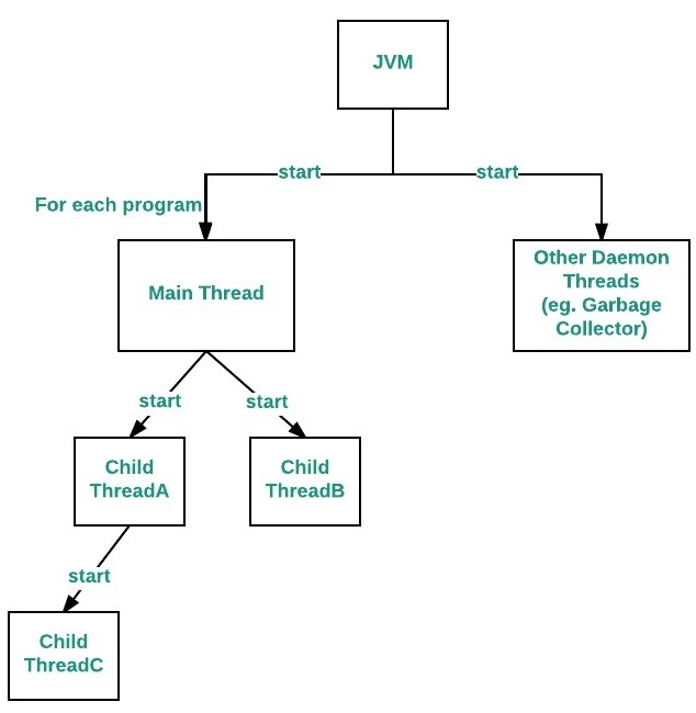 Diagram of spawning threads flow For each program, The Main thread is created by JVM. that thread verifies the existence of the main() method, and then initialize the class.