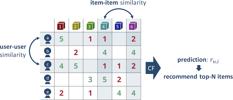 - Item-Item CF: choose items for a user, because this user has liked similar items in the past