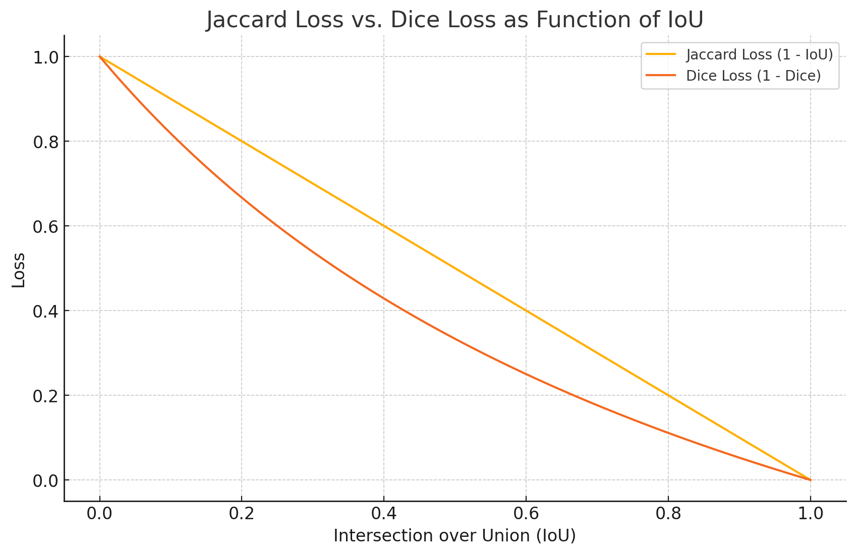 - Dice Loss: 낮은 IoU 영역에서 비선형으로 급격한 펄스를 줘 소형 객체나 초기 학습에서 빠른 수렴 유도