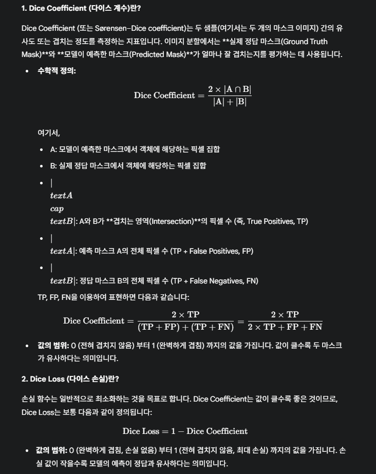 - 두 Loss 모두 0–1 사이지만, Dice 식에 분모가 2 TP+FP+FN2\,\text{TP}+\text{FP}+\text{FN} 이므로 소수 FP/FN 존재 시에도 더 높은 값을 유지