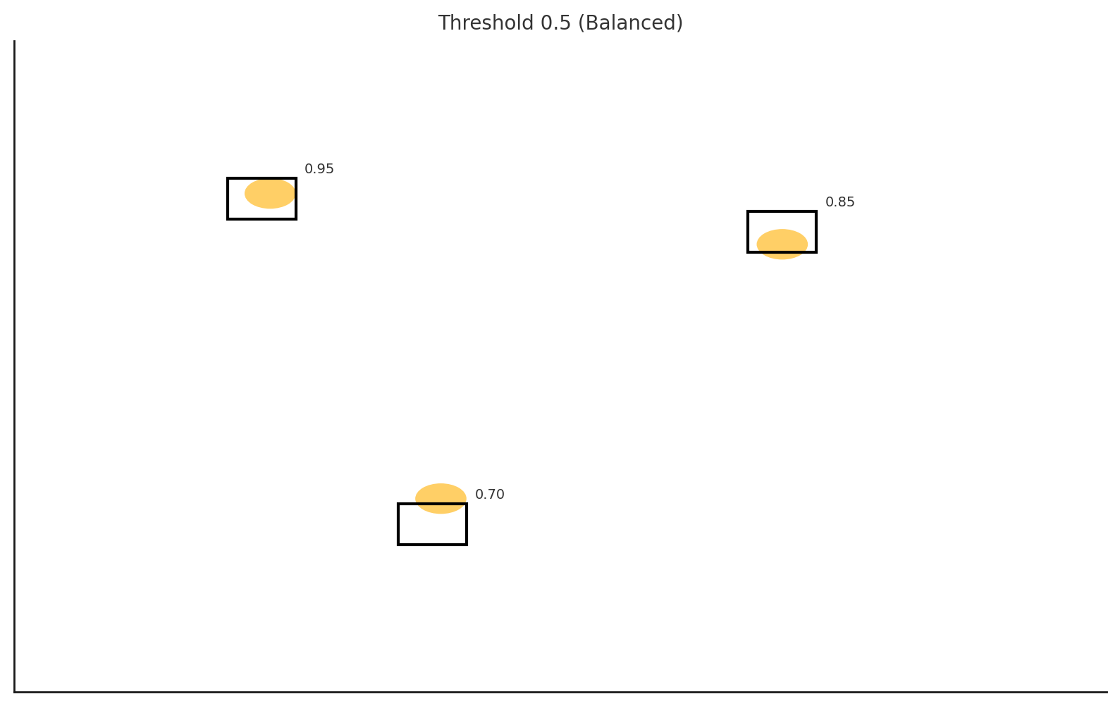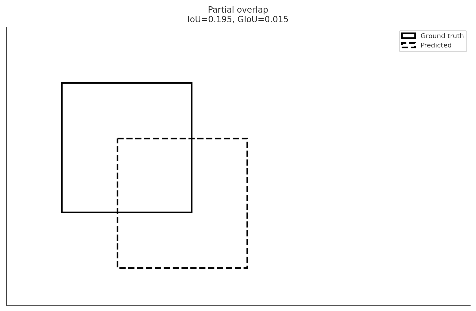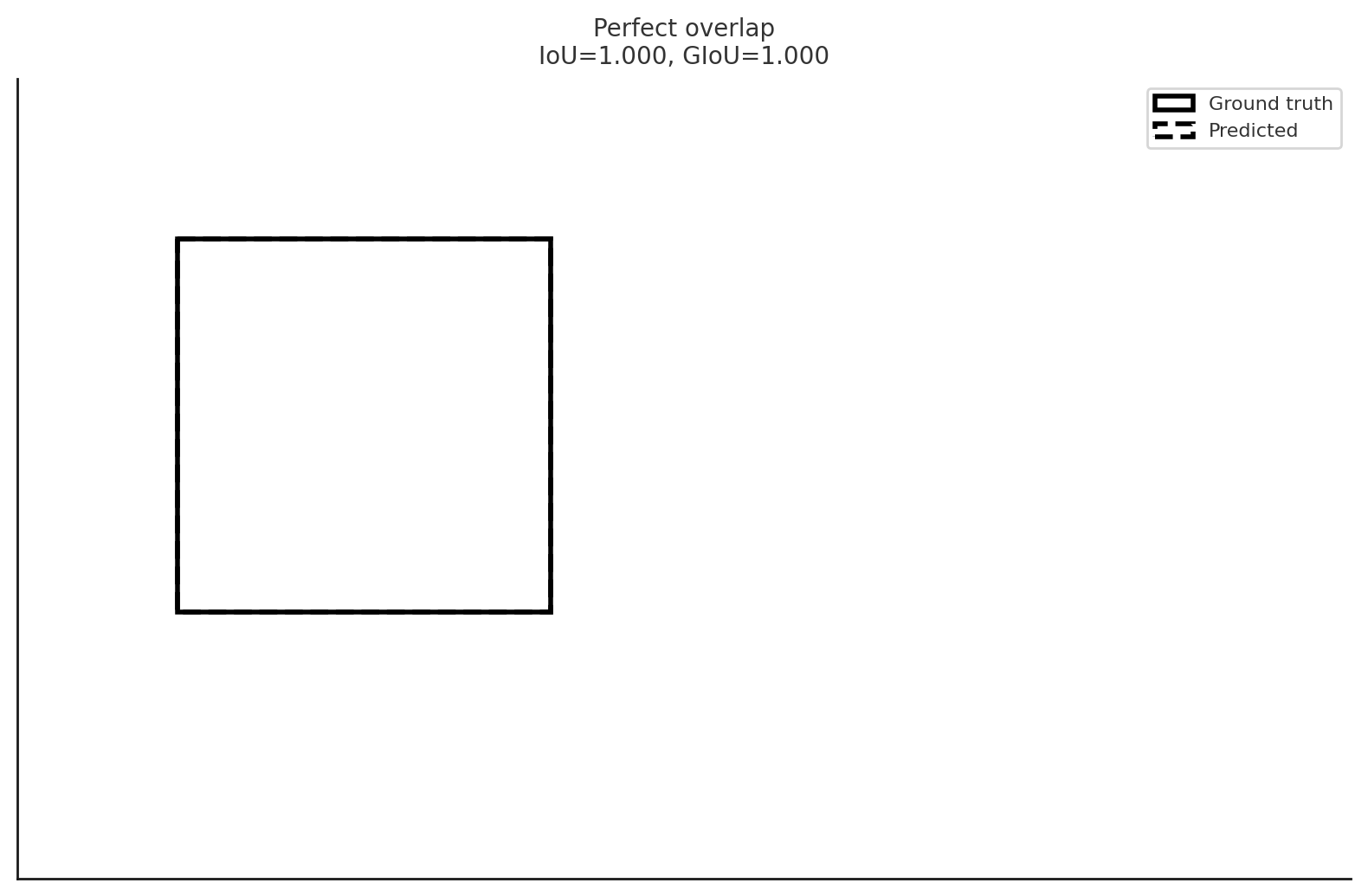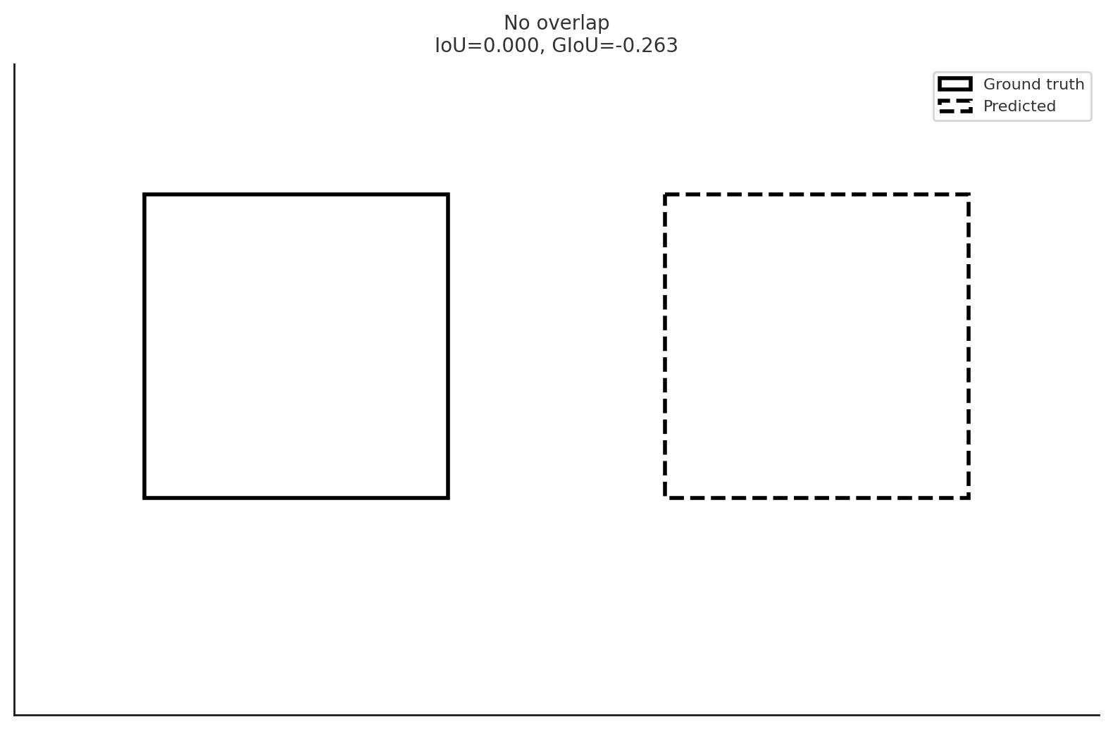Perfect overlap 1.000 1.000 두 박스가 완전히 일치 → 외접 C = A = B, 빈 공간 0 ⇒ GIoU = IoU = 1 Partial overlap 0.195 0.015 교집합은 작고 외접 C 가 커서 빈 공간 비율 ↑ → GIoU가 IoU보다 더 낮음 No overlap 0.000 –0.263 IoU = 0 이라 gradient 0 이지만, GIoU는 음수 페널티 → 학습 신호 유지