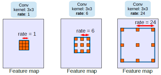 Atrous convolution: dilate rate를 조절하여 receptive field를 키움
