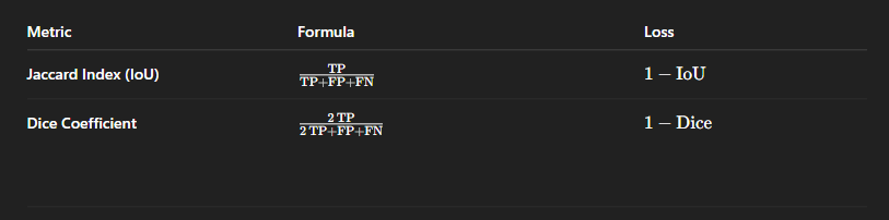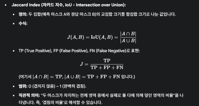 - Jaccard Loss(IoU Loss): 객체 탐지의 위치 회귀(IoU-based), 세그멘테이션에서도 쓰이나 Dice 만큼 보편적이지 않음