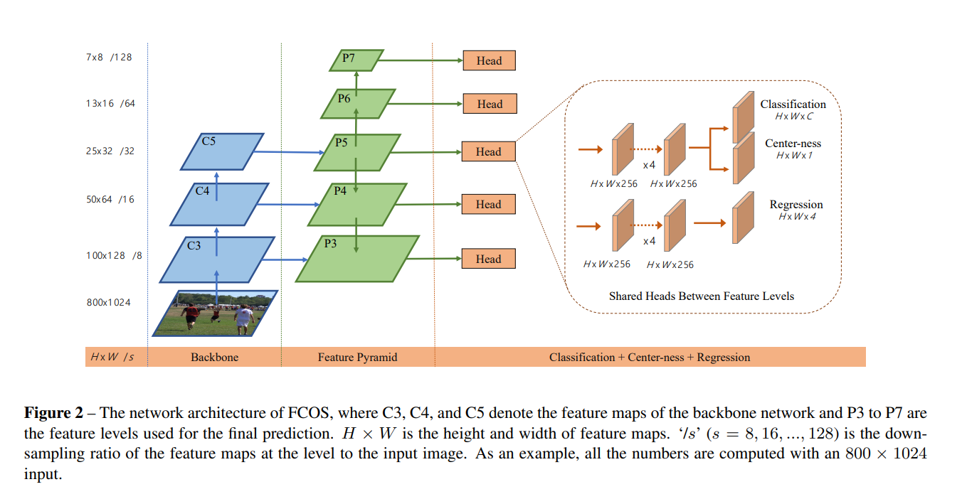 Anchor box size나 scale을 custom하게 설정하는 것이 아니라 class label classification, bounding box regression, and centerness 등을 prediction함. 또 FPN으로 다양한 scale에 대한 객체 처리.
