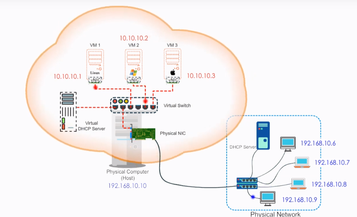 In this mode, VMs rely on the host to act as a NAT device. With the NAT mode, a virtual DHCP server is responsible for assigning IP addressing information to these VMs and they form a private network. Other machines on the physical network are getting IP addressing information from the physical DHCP server. They form an external network. The host is sitting between these two networks and translates the IP address from a VM to the IP address of the host. It also listens for returning traffic so that it can deliver it to the VM. The external physical network sees traffic from VMs as if it comes from the host itself. The NAT is appropriate when virtual machines are mainly used a client workstation to check emails or surf the Internet.